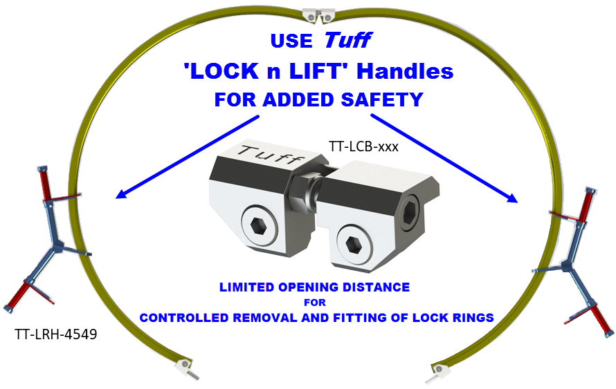 The Tuff Limiter Clamps are engineered to provide a SAFE efficient way of clamping, fitting and removing Two Piece Lock Rings from OTR Wheel Rims used on Mine Sites.